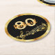 Black background with faux gold music notes for a 80th birthday party. With a faux gold frame. Templates for age and name. The name is written in a hand-lettered style script. Golden letters and number.