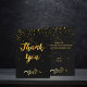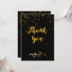 A black background colour and golden confetti rain. On front a hand lettered style script and the text: Thank You! and a floral faux gold decor.