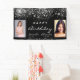 A banner for a girly and glamourous birthday party for two girls, women. A chic black background with faux silver glitter dust. Add your own 2 two photos of the birthday girls. Text: Happy Birthday. The word Birthday and the names are written with a modern hand lettered style script. Can be used as a welcome banner and as party wall decoration.