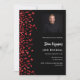 A modern, elegant and invitation. A black background decorated with red confetti. Personalise and add photo, a name and party details. White text.