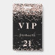 A modern, stylish and glamorous badge for a 21st (or any age) birthday party. A modern, stylish and glamorous badge for a 21st (or any age) birthday party. A black background with rose gold faux glitter dust. With the text: VIP. Personalize and add name, age, address/date. The name is written with a modern hand lettered style script with swashes.