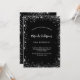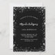 A stylish black background. Decorated with faux silver glitter, sparkles. Personalise and add a name, age and party details. The name is written with a hand lettered style script