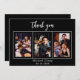 Add 3 of Your birthday photos, vertical size, a date, name, and the thank you note. A classic black background with white text and frame. The text: Thank you on the front and your name on the back are written with a stylish hand lettered script.