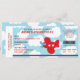 Aeroplane ticket invitation in red & blue with cloud background. Perfect for boys birthday party / baby shower.