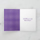 White sheer bow with white daisy and gift tag on white and purple polka dot pattern.