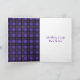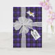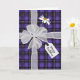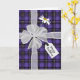 White sheer bow with white daisy and gift tag on black and purple tartan plaid pattern.