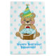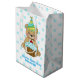 This is a cute gift bag for a little boy's birthday party! It features a teddy bear wearing a striped birthday hat. In front of the bear is a blue frosted cupcake with a cherry on top. The blue custom text currently says Happy Birthday (Your Custom Name) but you may change it to anything you'd like. The images and text are placed on a light pastel blue and white polka dot background. Both sides of the bag have the same image. *Thanks to Real Deal Clipart for the clipart used to create this design.