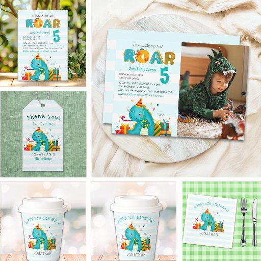Get ready to stomp, chew, and roar your way through an unforgettable birthday celebration! This dinosaur-themed invitation design and personalized party accessories are perfect for your little explorer's special day.