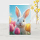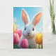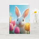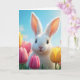 A fluffy white rabbit with large ears is surrounded by colourful tulips, basking under a bright, sunny sky.