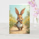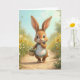 A cute brown rabbit wearing a blue apron and holding a basket is walking down a flower-lined path.