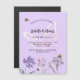 A violet, lavender coloured background. Decorated with bees and painted wildflowers in violet and pink and a large butterfly. Personalise and add a name and party details.