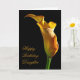 A stately golden arum lily stands lit from the side . A perfect flower to convey your birthday wishes.