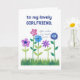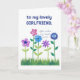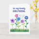 A pretty Birthday Card for a Girlfriend, with a row of pink, blue and purple flowers pushing up through the grass, from a handpainted paper collage by Judy Adamson. Please contact me through my store if you would like the front cover text changed and feel free to change or delete the inside greeting if you wish.