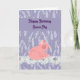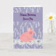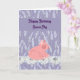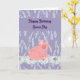 Birthday card for pet pig in a lavender and white design with floral weeds in white on a lavender background. The pink pig is laying on a bed of faux lace. Can be used for adults, or kids. The words on the inside can be changed. Thanks to Pixabay and Creative Fabrica for some of the elements in the design