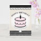 A birthday card featuring a light pink and black color scheme. Illustration of pink and black birthday cake with one candle on a cake stand at center. Black polka dots on bottom, black and white scalloped edges design on top. Text reads "Happy Birthday." Personalize the inside.
