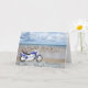 A blue motor cycle standing on a beach with fluffy clouds in the sky. Happy Birthday written in rock reflected in the water lying on the sand.