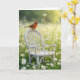 A cardinal perches elegantly on a wicker chair surrounded by a field of daisies.