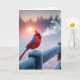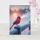 A vibrant red cardinal is perched on a frost-covered fence, with musical notes flowing from its beak into the chilly air.