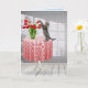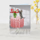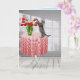 Tabby Cat for birthday red tulip bouquet on old table with red and white gingham tablecloth.