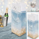 A birthday gift bag for a elegant and glamourous 30th (or any age) birthday. A faux gold glitter shimmering on a light blue background. The light gold colour gives a champagne bubbly style. The name is written in elegant brown with a modern hand lettered style script. Template for a date and birthday celebrated. Top part is the text - Pop the champagne. On the back the text is Happy Birthday in same elegant script as front.