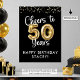 Celebrate a 50th birthday with a welcome sign printed on a poster print featuring the title CHEERS TO 50 YEARS with faux metallic gold balloon numbers and modern script typography, confetti and your custom message in your choice of background colour (shown in black). OPTIONS: The sample is shown in a 18x24" size on Value Paper (Matte); other standard and custom print sizes, paper quality and framing, Instant Digital Download file for printing locally or transferring the design to a foam board, banner, canvas or other product options are available on the ordering page. RESIZING TIP: Choose Custom Size for even borders by changing the height and width proportionately AFTER clicking the UNLOCK icon (looks like a chain link). ASSISTANCE: For help with design modification or personalisation, colour change, resizing or transferring the design, contact the designer BEFORE ORDERING via the Zazzle Chat MESSAGE tab or email makeitaboutyoustore@gmail.com.