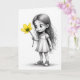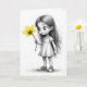 A sketch of a young girl with long hair holding a yellow flower while looking at it with wide-eyed wonder.