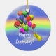 A cute little chicken is being carried away by colourful birthday balloons! Customisable text says "Happy Birthday!".