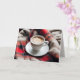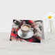 A cup of coffee on a saucer with cream heart design on a plaid red and grey blanket for a birthday.