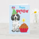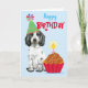 Happy birthday greetings with this cute design featuring a smiling, party hat-wearing English Cocker Spaniel puppy with a birthday cupcake. Text can be easily changed; just click on customise button.