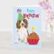Happy birthday greetings with this cute design featuring a smiling, party hat-wearing English Springer Spaniel puppy with a birthday cupcake. Text can be easily changed; just click on customise button.