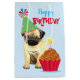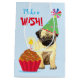 Happy birthday greetings with this cute design featuring a smiling, party hat-wearing Pug puppy with a birthday cupcake. “Happy Birthday” on front and “Make a Wish!” on the back. Text can be easily changed; just click on customise button.