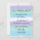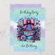 Graphics of a vanilla cupcake with purple and blue frosting with flowers and a bow. Purple, teal, blue and pink personalised birthday invitations for a birthday party.