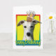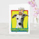 Celebrate a birthday with this whimsical Whippet Dog Greeting Card. With a cupcake balanced on it's head, this design is sure to bring a smile and giggles! BTW, This design has several versions, with different background colours. There is also an invitation to a Party version.