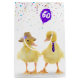 Cute fuzzy yellow duckling couple on a white background with a purple 60th birthday balloon.