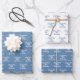 Elegant, trendy party wrapping paper sheets. 2 sheets with dusty blue backgrounds, white text. One sheet with white background and blue text.