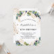 For a 40th (or any age) birthday. A white background decorated with eucalyptus greenery and golden leaves. Personalise and add your names and wedding details. Black and golden coloured letters.