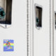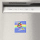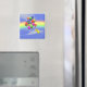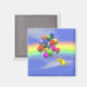 A magnet with a little chicken being carried away by brightly coloured balloons, on his birthday.