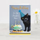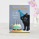 Birthday paper greeting card for a mum, mother. A black cat wearing a party hat on one ear and a unique cake with a fish and balloon bubbles are on the cover of the card. Art, image, and verse copyright © Shoaff Ballanger Studios, 2023.