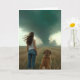 A young woman and her golden retriever dog stand in a field, gazing at an ominous tornado funnel in the distance for birthday.