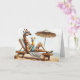 A cute giraffe sitting in a beach chair wearing a swimsuit and drinking a cocktail.