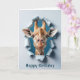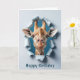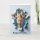 A giraffe's head playfully emerges through a piece of torn of paper, creating a 3D effect against a blue background for a birthday.