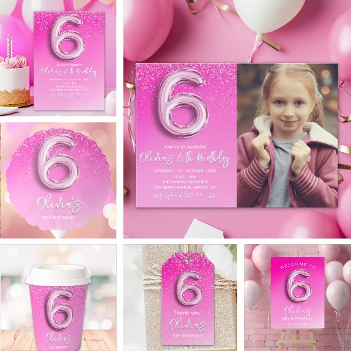 Celebrate your little girl's 6th birthday in style with this elegant and sparkly invitation! Featuring a pink balloon number "6", delicate rose floral accents, and glitter details, this design is perfect for a glamorous and feminine birthday party. Ideal for princess, garden, or pink-themed celebrations. Personalize with your party details and make her special day unforgettable!