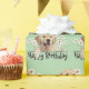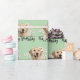 Cute golden retriever with white daisy bouquet on mint green background for birthday.