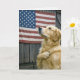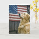 A golden retriever sits in front of a rustic barn with an American flag with a paw resting over its heart, symbolising loyalty and pride