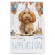 Cute cartoon illustration of Goldendoodle dogs wearing a birthday hat surrounding a birthday cake and balloons. Perfect for pet lovers or dog parents.