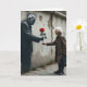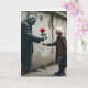 An elderly woman extends her hand towards a graffiti mural of a man offering a vivid red rose on a weathered wall
