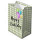 Sage green and white gingham check pattern with Happy Birthday text and balloon bouquet.