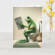 A large green frog is sitting on a toilet in a bathroom, reading a newspaper titled "The Daily News" for birthday.