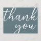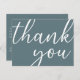 A slate grey background. On the front large hand lettered script with the text: Thank You. Back: Template for your Thank You note and name/names. Tip: If you don't want it to look like a postcard, click customise, go to the back and remove the divider and post stamp.