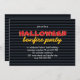 Halloween birthday party design featuring the words "halloween bonfire party", against a black and blue horizontal stripes/striped background. In red, yellow and orange colours, the design is great for a teen boy birthday party.